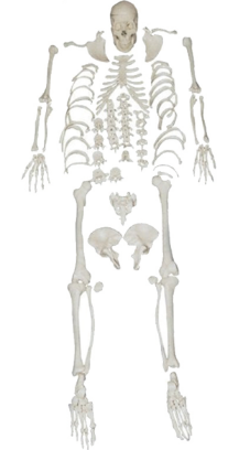 2.)Life-size, disarticulated adult skeleton includes 3-part skull, right hand and right foot on wire.