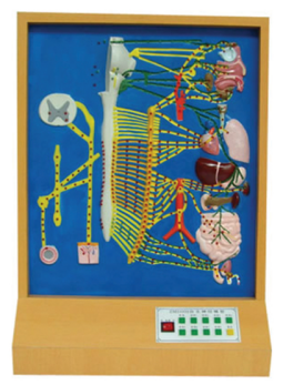 1.It shows that the lower central nervous system, sympathetic nerve, parasympathetic preganglionic and postganglionic fibers. The left side of the model shows the relationship between the sympathetic nerve and the spinal nerve and the position and three directions of the prenodal fibers of the sympathetic nerve, and the main part is on the right, which clearly shows the distribution of the structural characteristics of the sympathetic nerve and parasympathetic nerve.