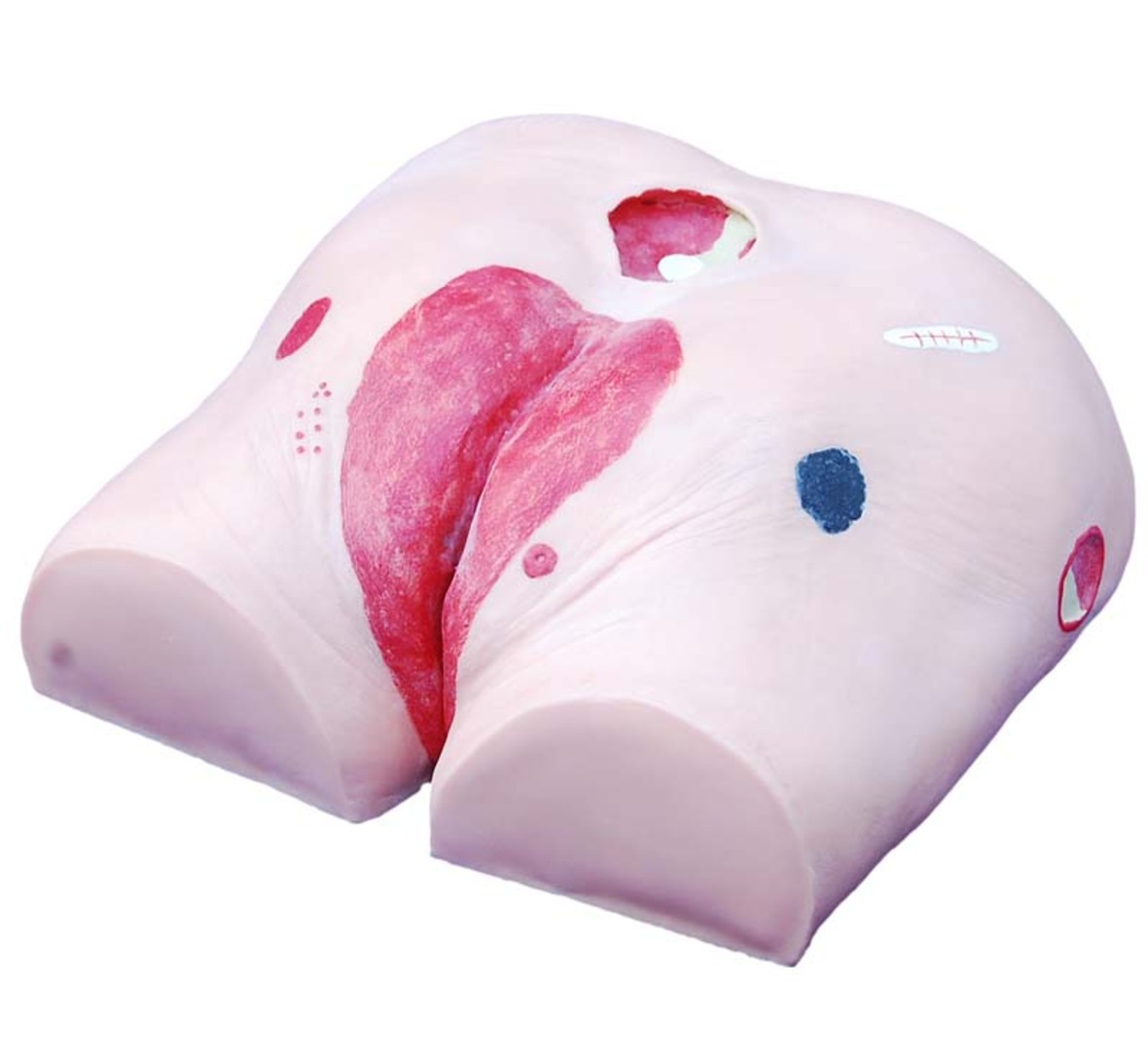 It is molded from an old patient, looks and feels realistic, it can help people learn more about decubitus ulcer training, decubitus ulcer staging, decubitus ulcer stages, and decubitus ulcer simulations. This care model shows 4 stages of ulceration formed by pressure ulcer. Shows eschar, subcutaneous fat, undermining, tunneling, slough, eschar and exposed bone (with osteomyelitis). It could be used for incision washing, evaluation and measurement, also the measurement of wound length, depth, undermining and tunneling.