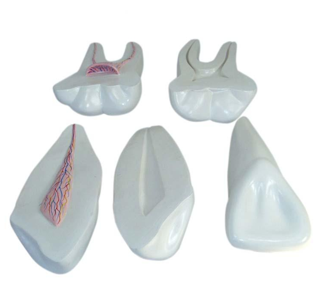 This model shows the morphological differences of the incisor, canine and molar teeth. Dissections of the canine and molar teeth demonstrate the structure of the enamel, dental pulp cavity. 3pcs/set. 12 times enlarged.