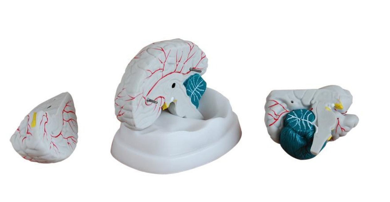 Demonstrate external features of human brain as a whole, as well as the relations between the component portions. Dissectible into 3 parts. Size: 18.4x14x13.5CM. On stand.