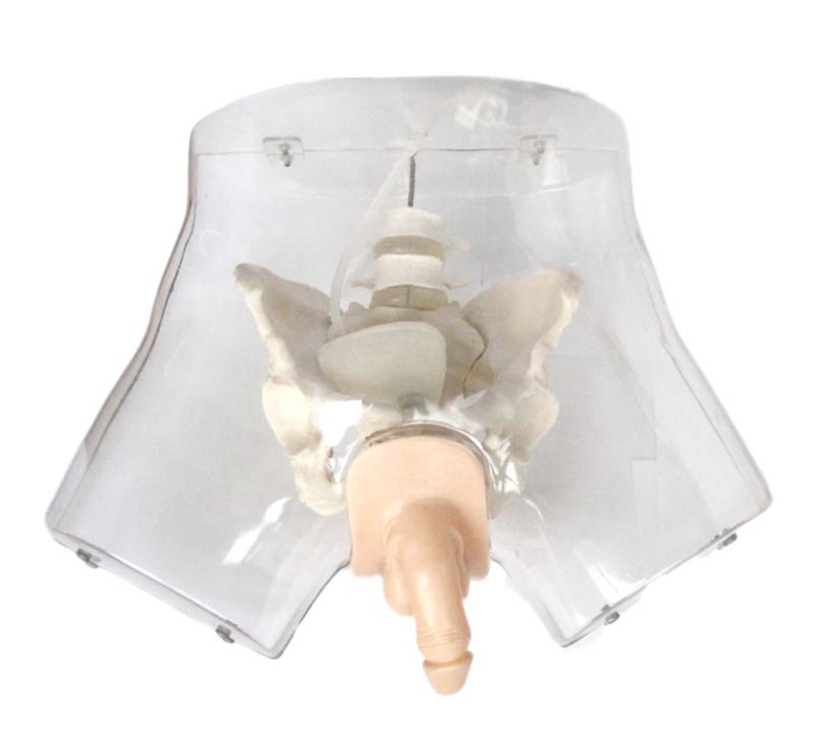 This simulator based on the normal human anatomy. Students can practice catheterization while observing what is happening internally, also view the indwelling condition of a balloon catheter, flow of urine, and the relative position of the pelvis and bladder through a transparent hypogastrium.