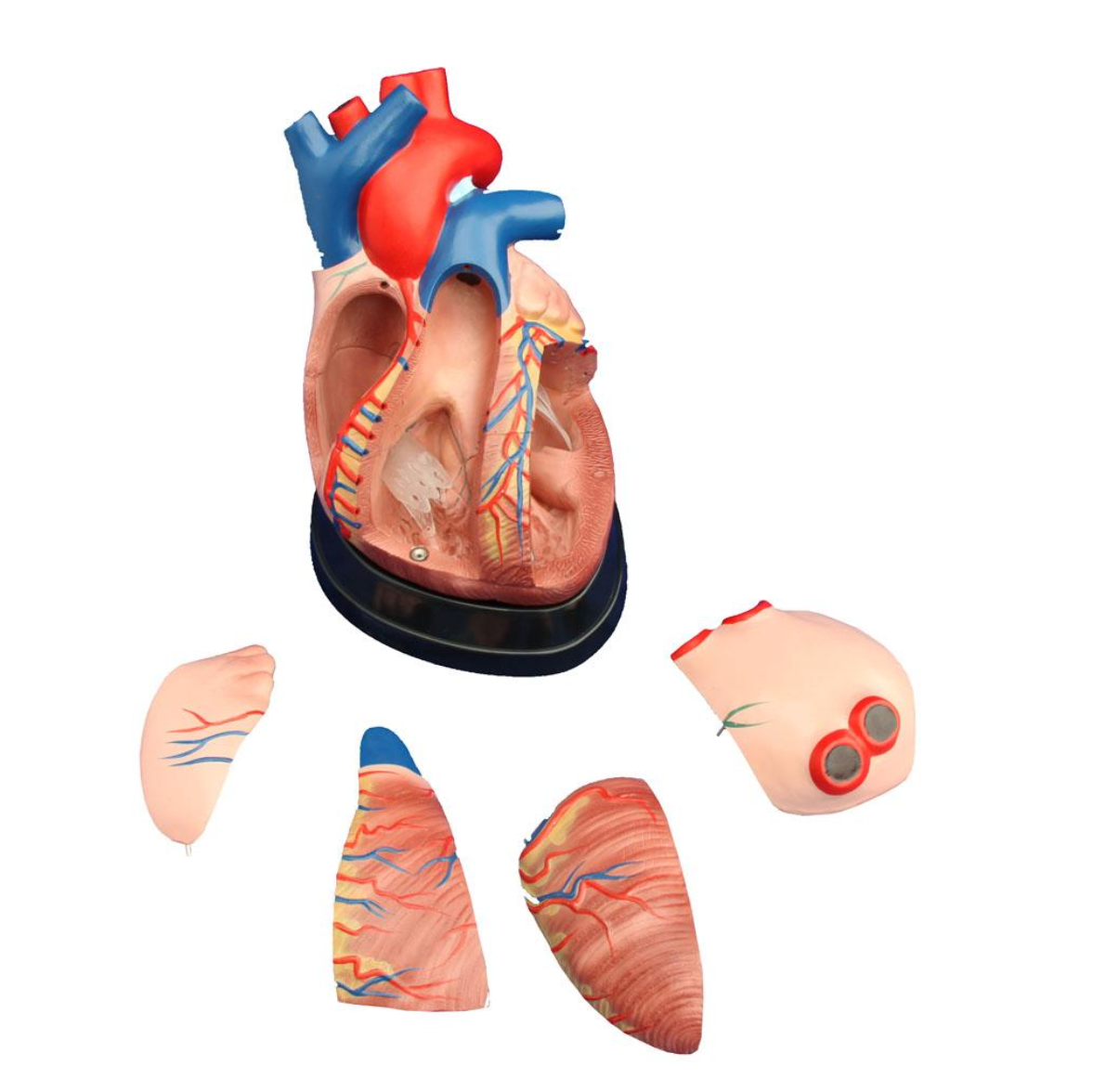 This model shows external features and internal structures of heart and its relation between large blood vessels. Dissectible into 5 parts, 3 times enlarged.
