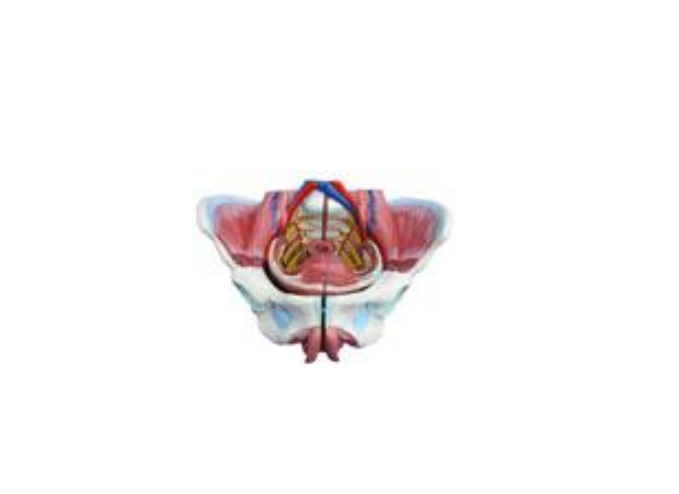 This model is painted in lifelike color. It shows all the interior and exterior female organs, blood vessels, ligaments, nerves, muscle structures within the framework of the bony pelvis. Life size.