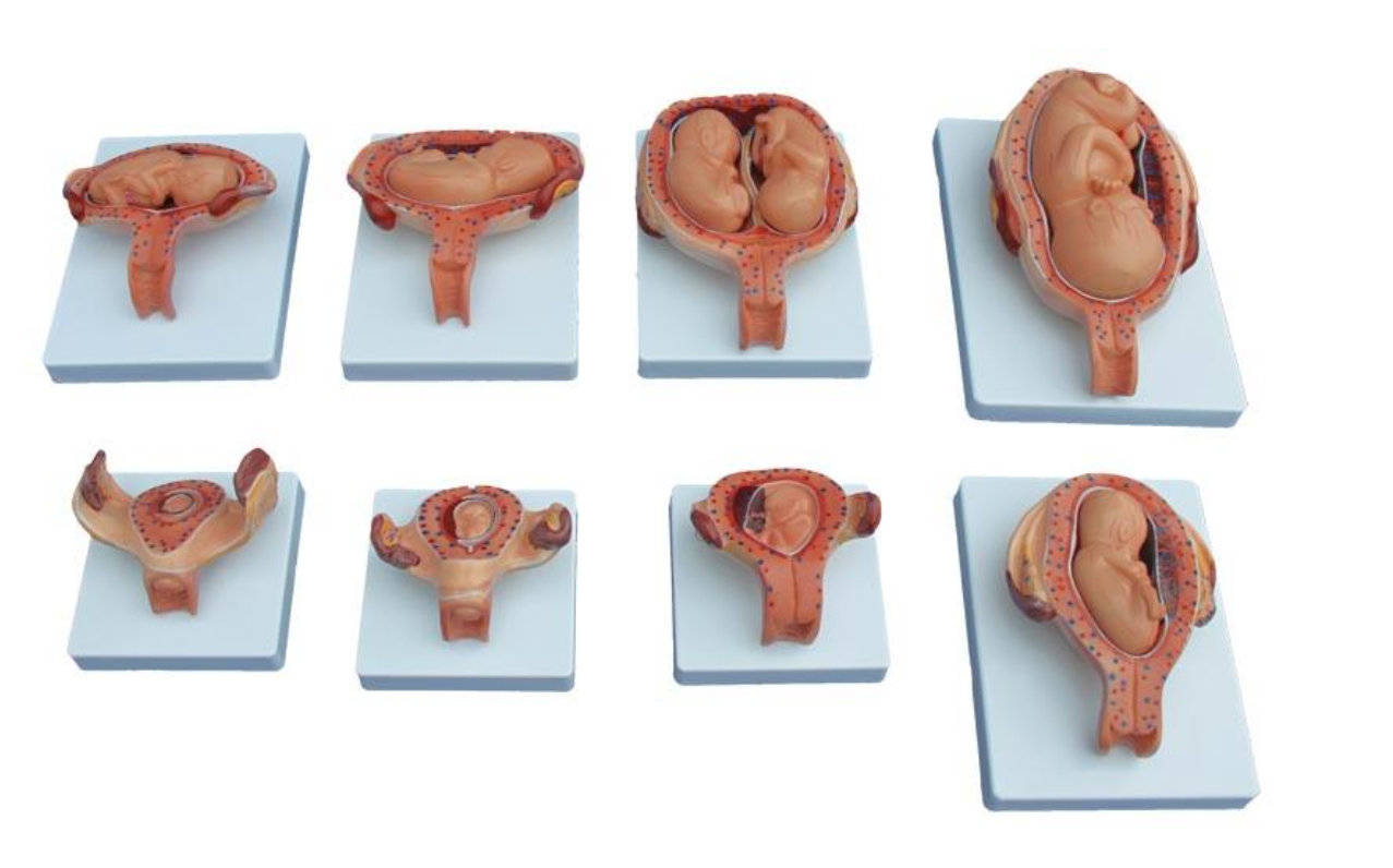This model shows relationship between fetus and uterus in 1st, 2nd, 3rd, 4th, 5th, 6th, 7th month pregnancy, and twins course in the 5th month. Consist of 8 parts.