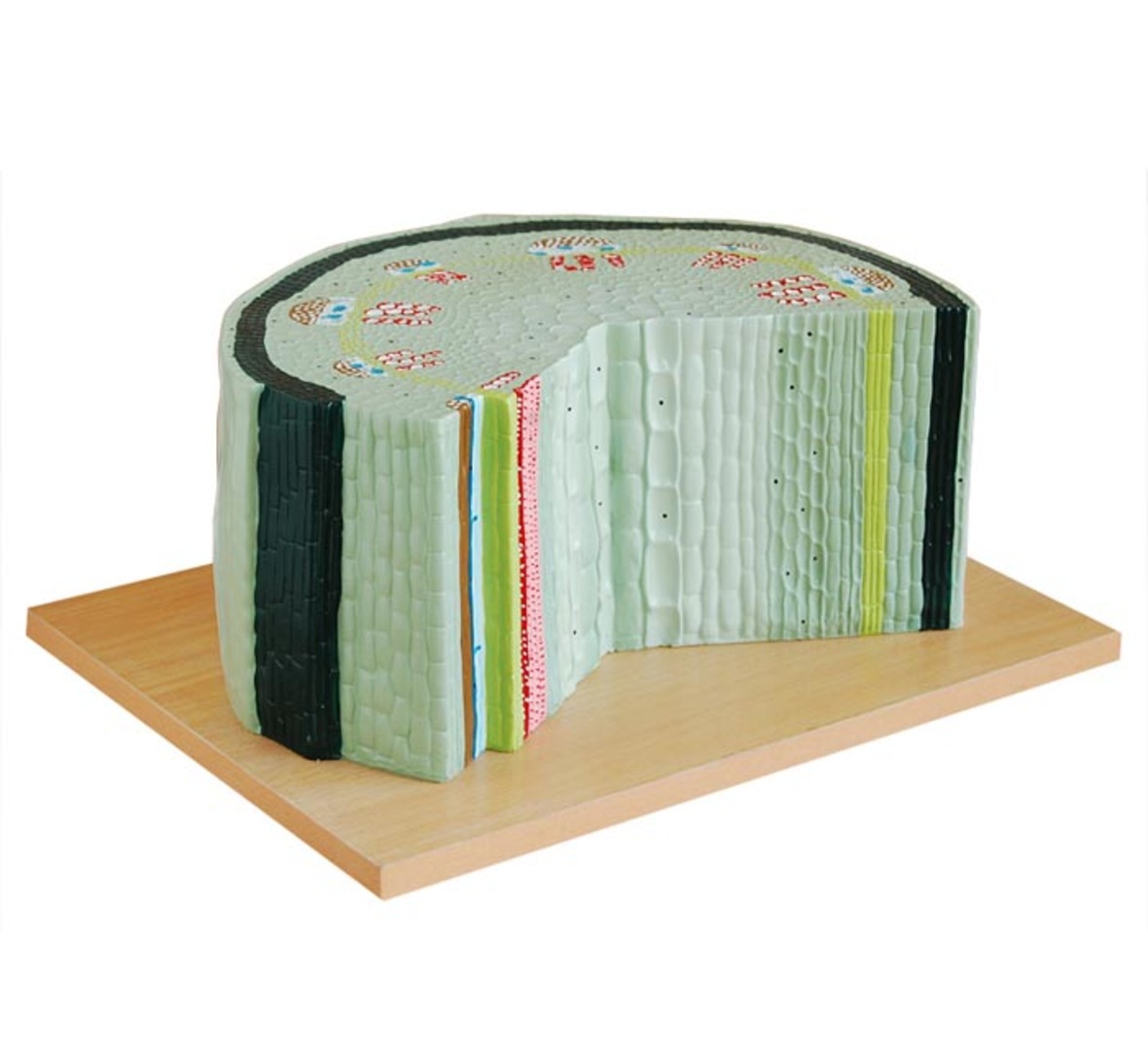 This model of a sunflower stem shows anatomy in cross, radial and tangential section. Shows epidermis,cork layer, phloem region, cambium, xylem region, pith and other important structures.