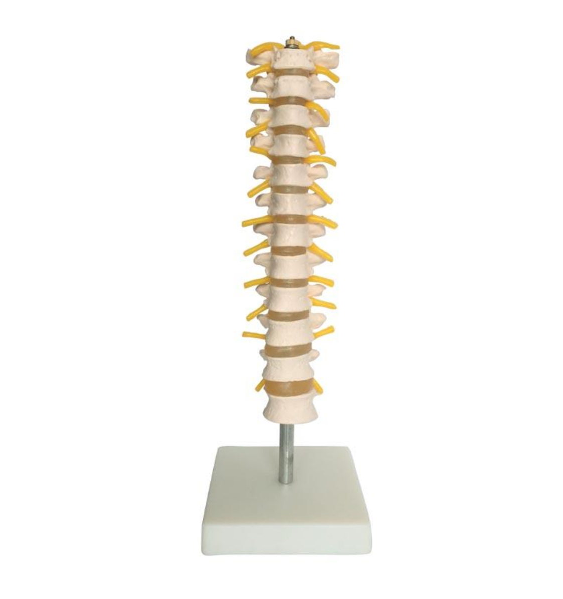 This model consists of the 12 thoracic vertebrae with intervertebral discs, thoracic nerves and spinal cord, on stand.