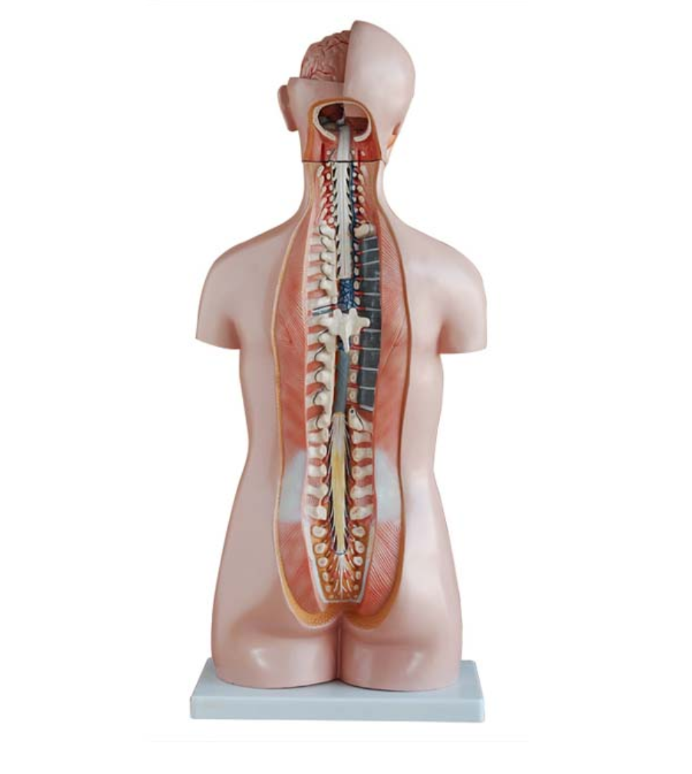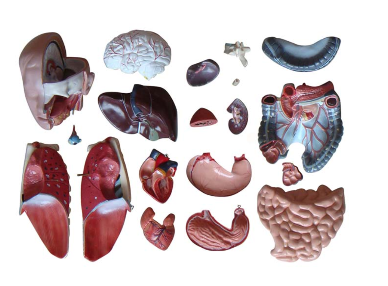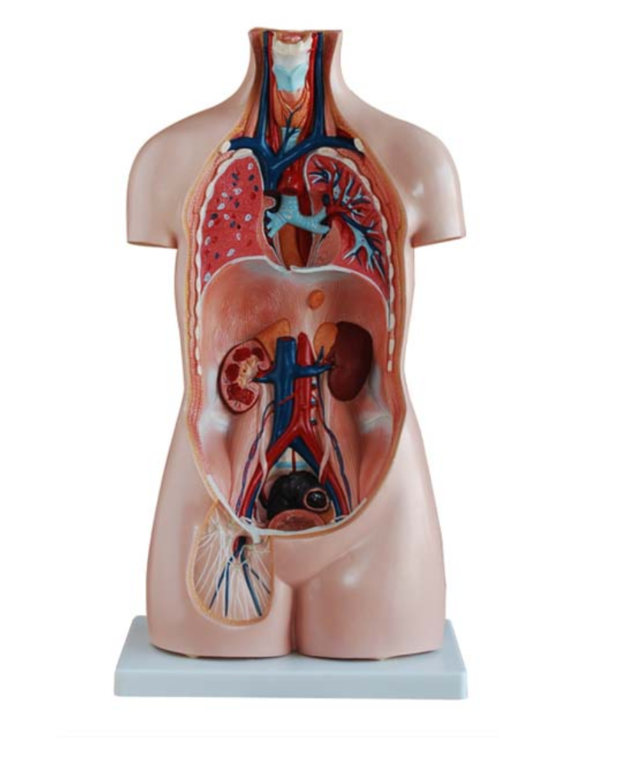 This sexless model including 20 dissectible parts: torso, head, eye, brain, lung with sternum and rib attachments (2 parts), heart (2 parts), stomach (2 parts), liver, spleen, kidney, intestine (4 parts), urinary bladder, vertebra spinal nerves (2 parts). Open back. Mounted on plastic base.
