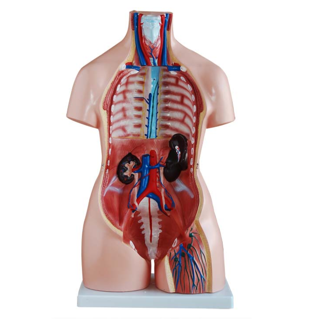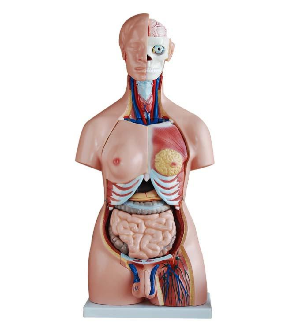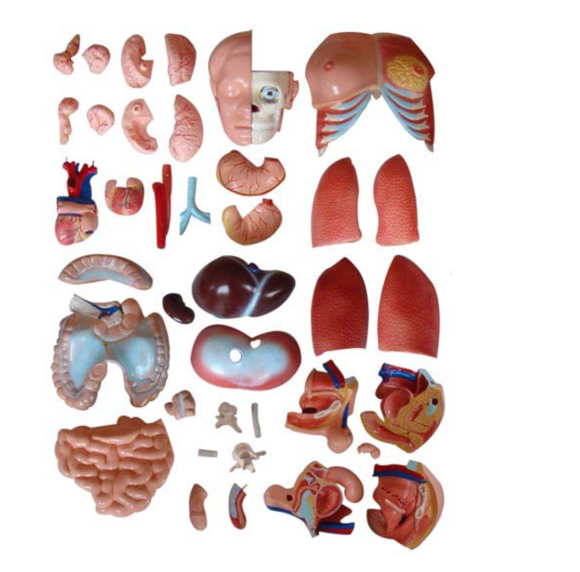 This unisex torso including 40 parts: torso, female breast plate, head, eyeball, brain (8 parts), vertebra spinal nerves (4 parts), lung (4 parts), heart (2 parts), trachea, esophagus and descending aorta, diaphragm, liver, kidney, stomach (2 parts), intestines (4 parts), male genitalia (4 parts), female genitalia with fetus (3parts).